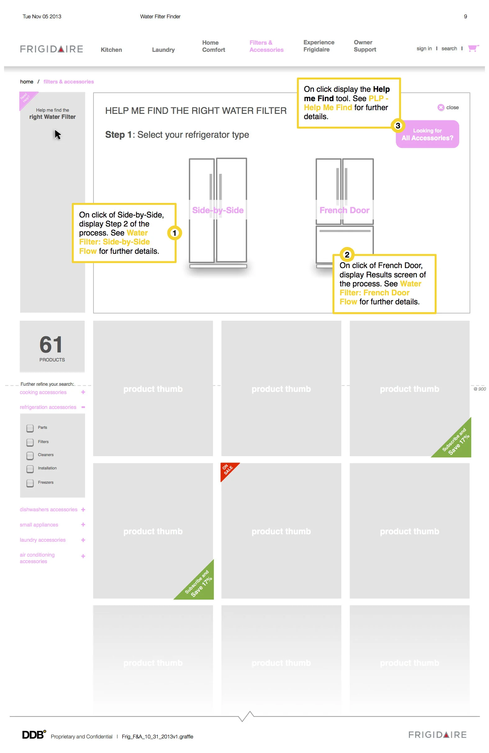 For the content audit, I worked with data scientist to identify sections and features that worked well on the existing site - this included the product comparison chart, quick-view overlay and zoom features, all of which to be reimagined with the redesign. Collaborating with the strategy team, we came up with a list of experiences that can help enhance user’s connection with the Frigidaire brand - this translated to the timeline, kitchen visualizer and inspiration galleries.